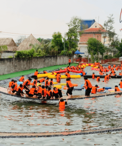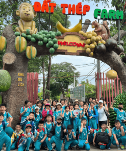 08h30 HDV tại điểm đón các em tại khu dã ngoại ÐẤT THÉP FARM. Các em tập trung nghỉ ngơi tại hội trường nhận đồ bà ba trang phục truyền thống của Nam Bộ và nghe giới thiệu chung về các hoạt động trải nghiệm tại Ðất Thép Farm, tham gia các hoạt động: